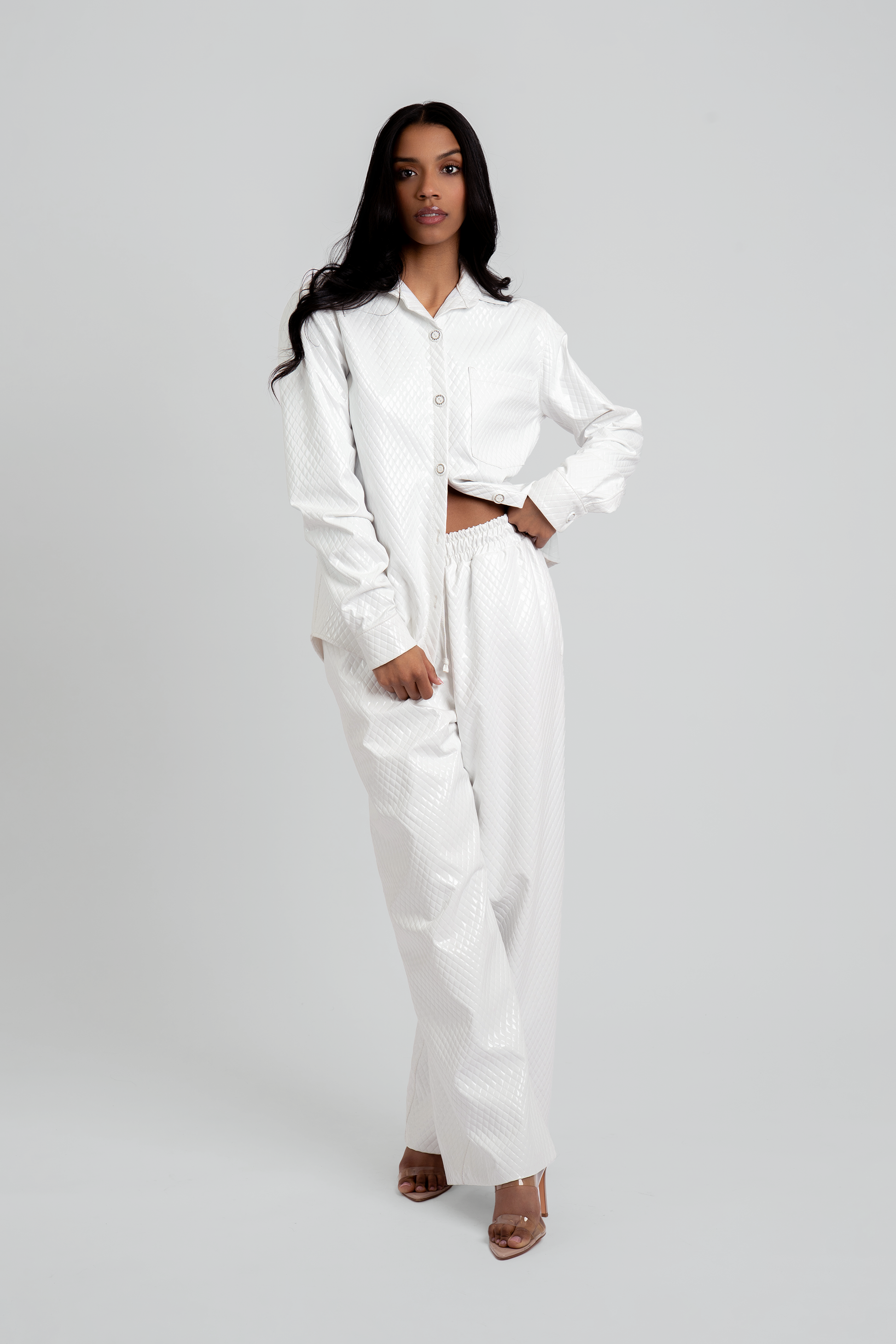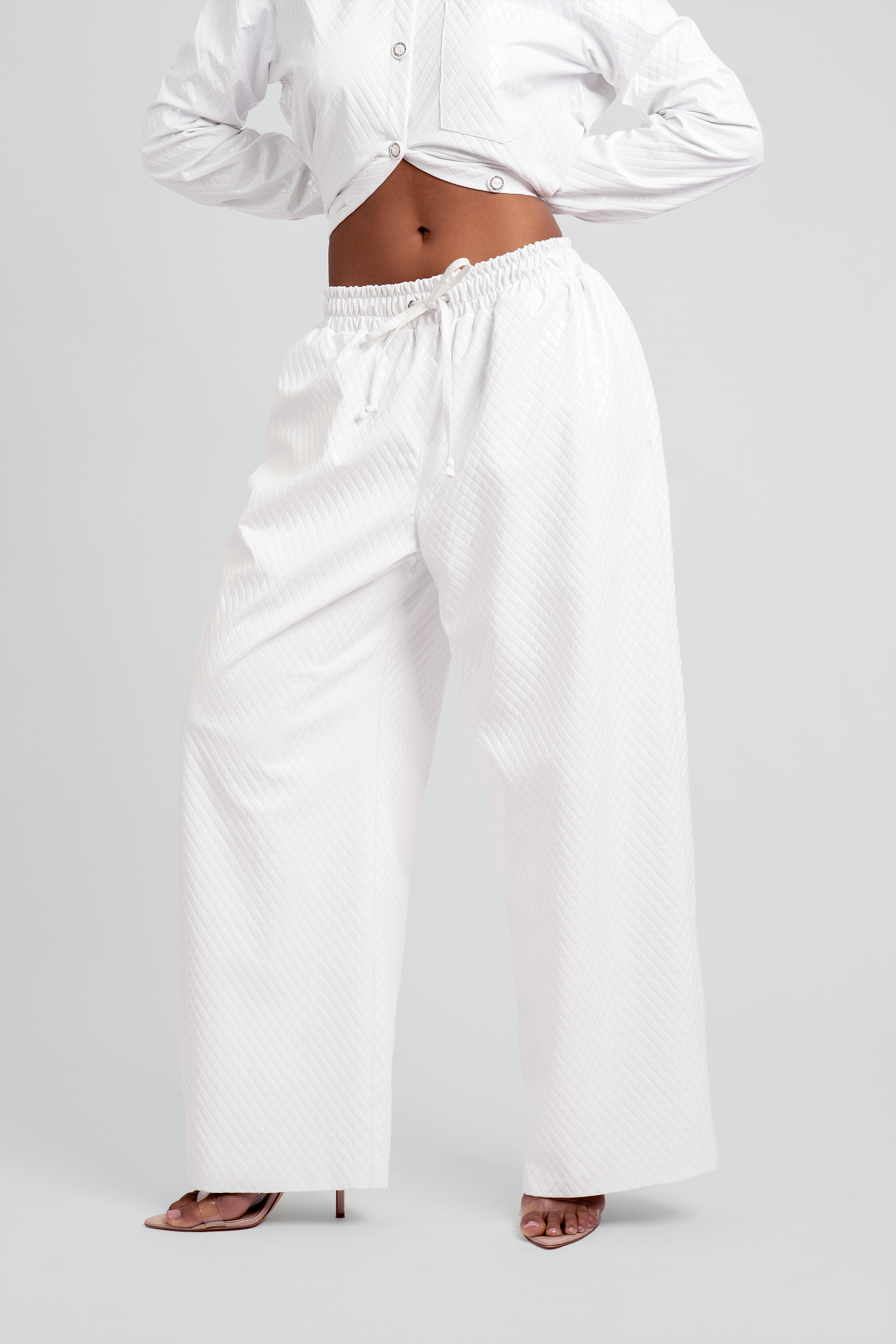 The Celeste Vegan Quilted Leather Pants bring modern luxury to elevated streetwear. Crafted from quilted vegan leather in striking white or red, these pants feature a stretch waistband with adjustable ties for a customizable fit. Designed to merge comfort with bold statement-making style, they exude contemporary edge with ease.