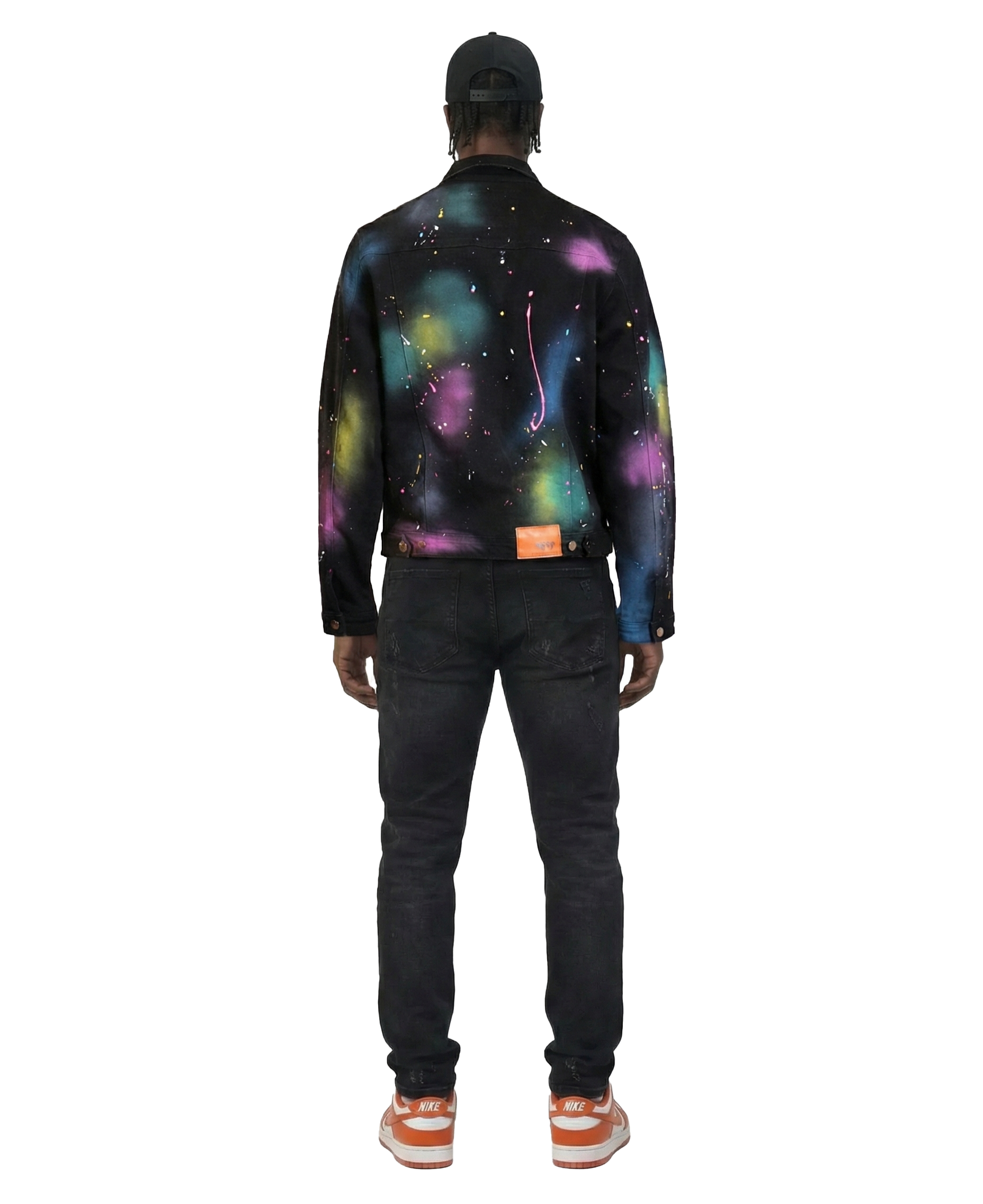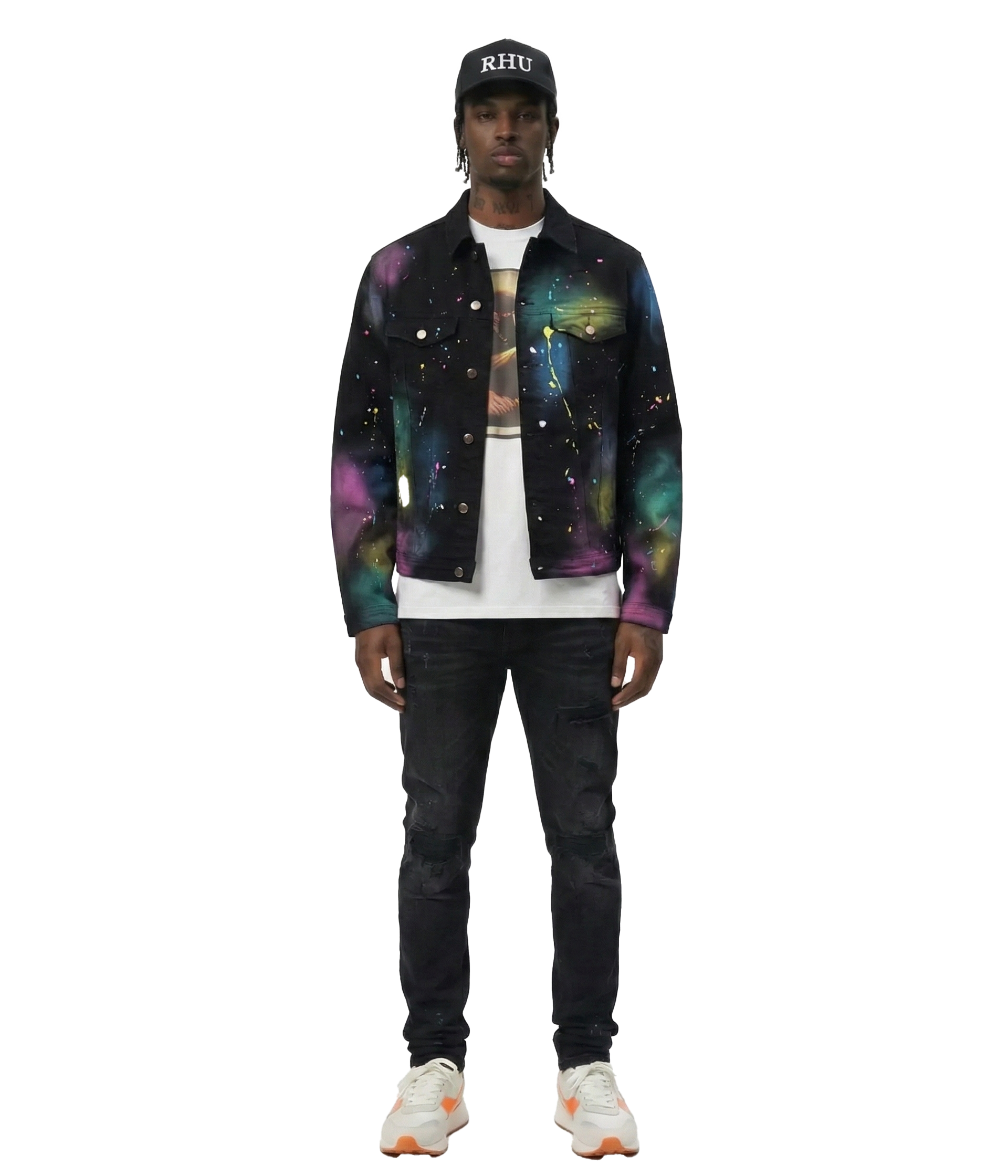 - Men's premium jet black twill denim jacket with heavy garment wash, spot