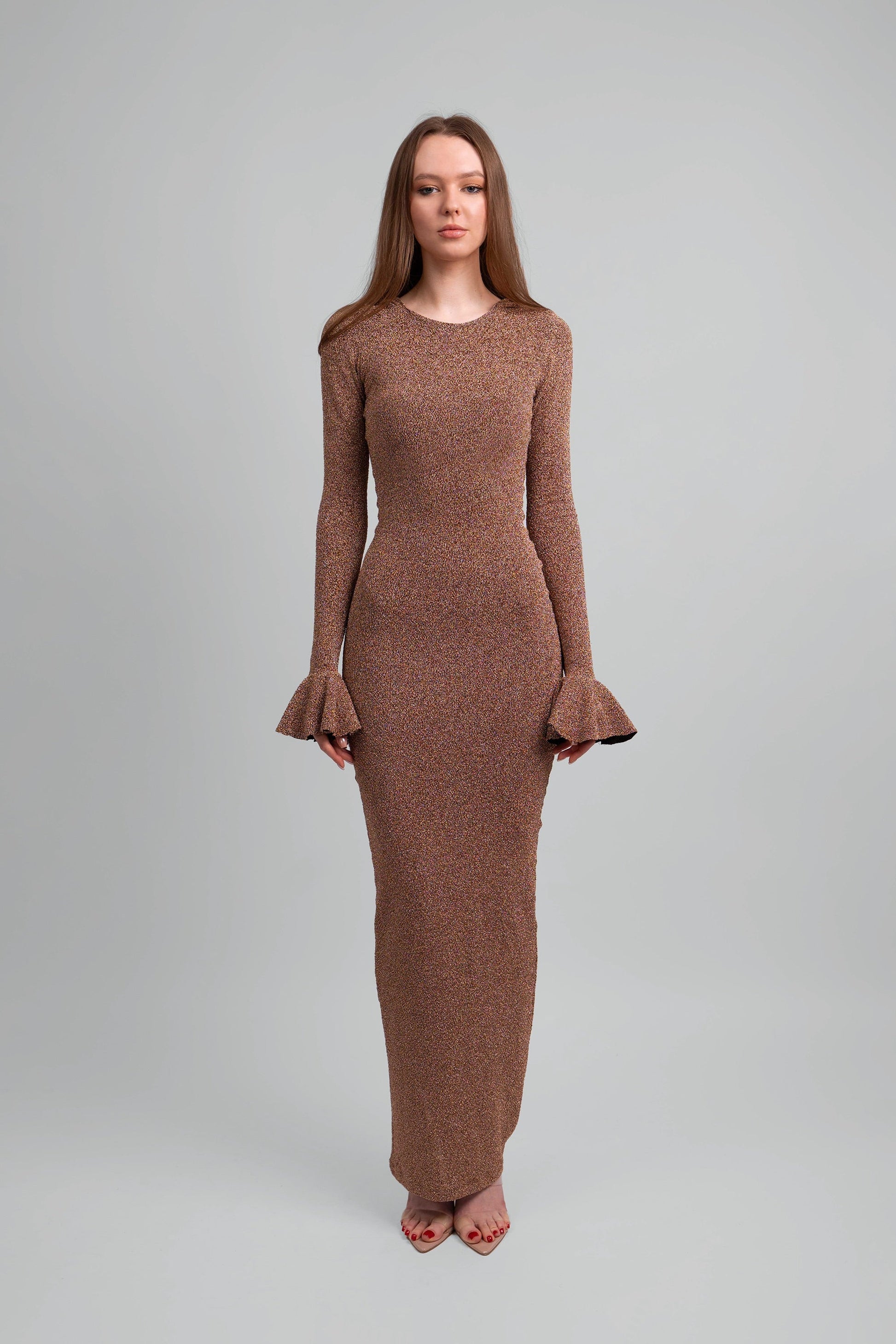 The Govina Long Sleeve Copper Event Dress is a luminous statement designed to captivate. Crafted from a radiant copper fabric, the material reflects light with a molten, metallic sheen that moves beautifully across the body. The silhouette features elegant long sleeves finished with soft ruffled cuffs, adding subtle texture and fluidity. A modern hood introduces a striking, contemporary edge, balancing sophistication with bold attitude.