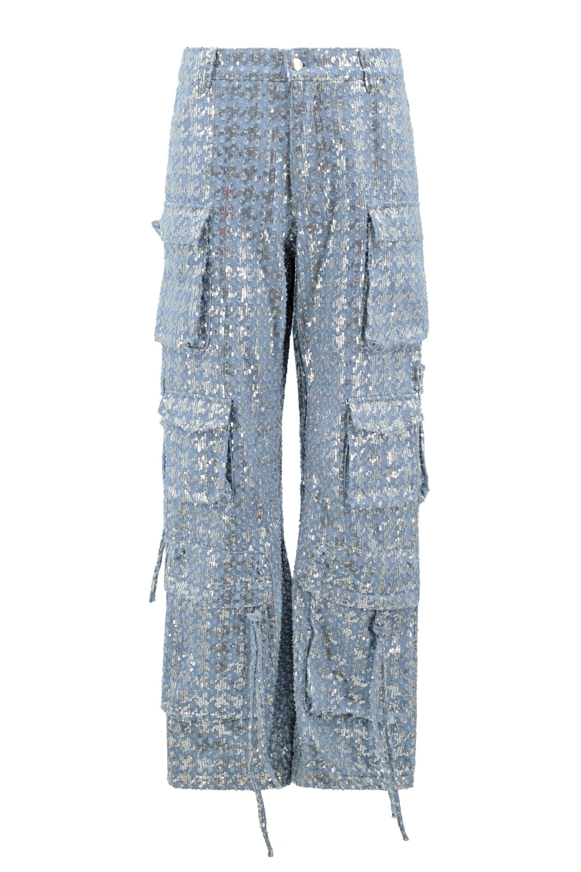The Kelly Cargo Pants are a show-stopping take on utilitarian chic, designed to command attention on and off the street. Crafted from light or medium blue denim and fully adorned with silver sequins, this fabric blends the rugged appeal of classic cargo pants with high-fashion sparkle. These relaxed-fit cargos feature multiple pockets and a zip-and-silver-button closure, offering both functionality and drama. Pair them with a sleek crop top or layer with the matching sequin denim jacket for a bold, runway-ready look.