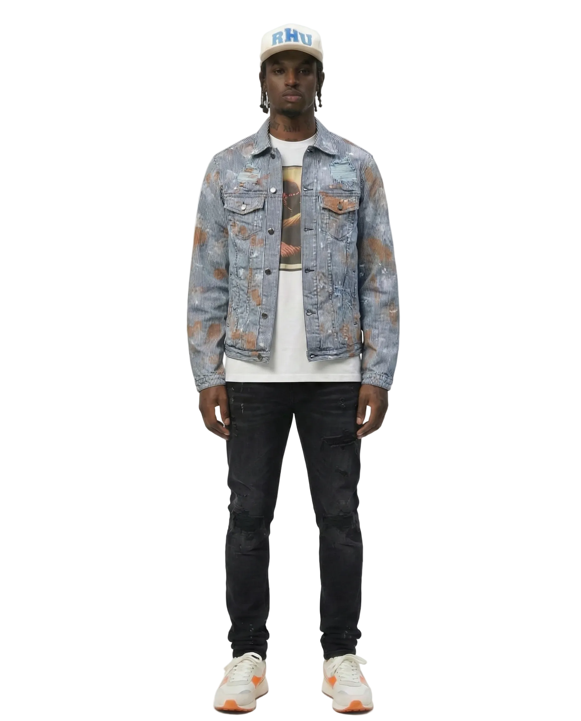 - Men's premium stretch denim jacket with heavy garment washes, heavy rip-offs with multi color rhinestone patched bonding behind rip-offs.