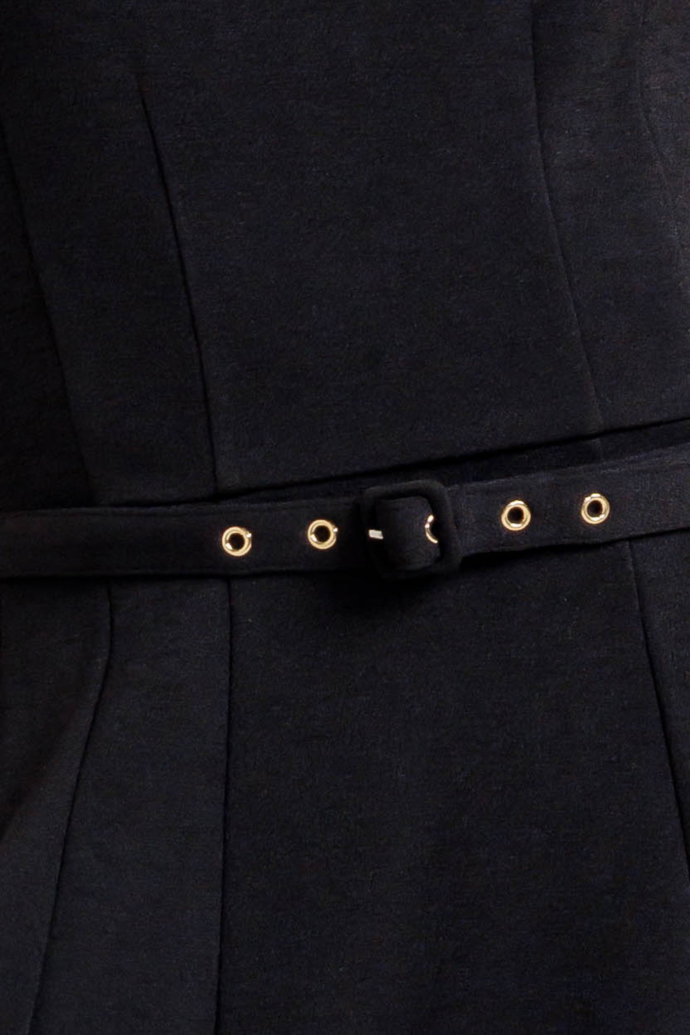 A solid woven midi dress featuring round neckline, drop shoulder, self belt, circle skirt, V back bodice and zipper closure