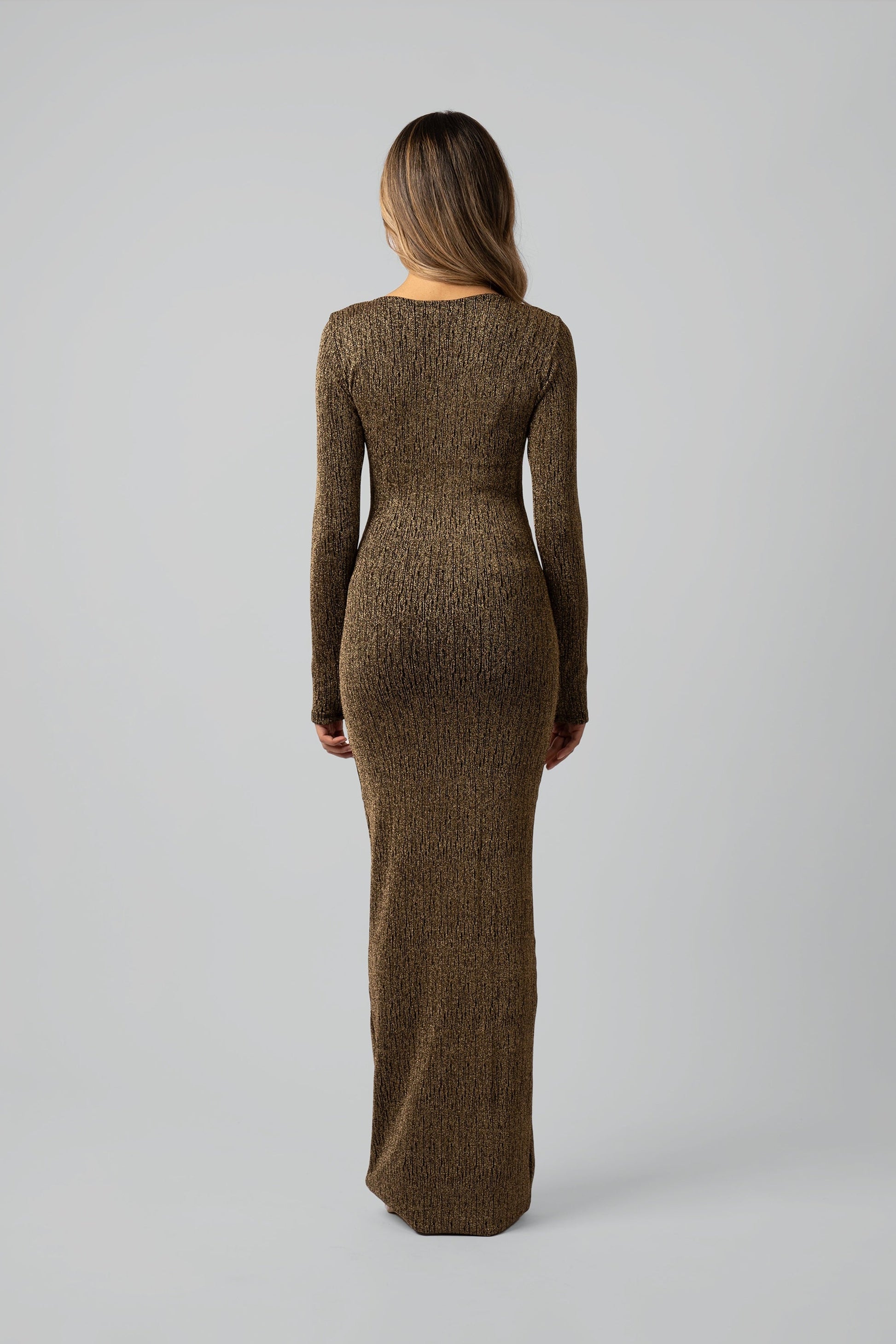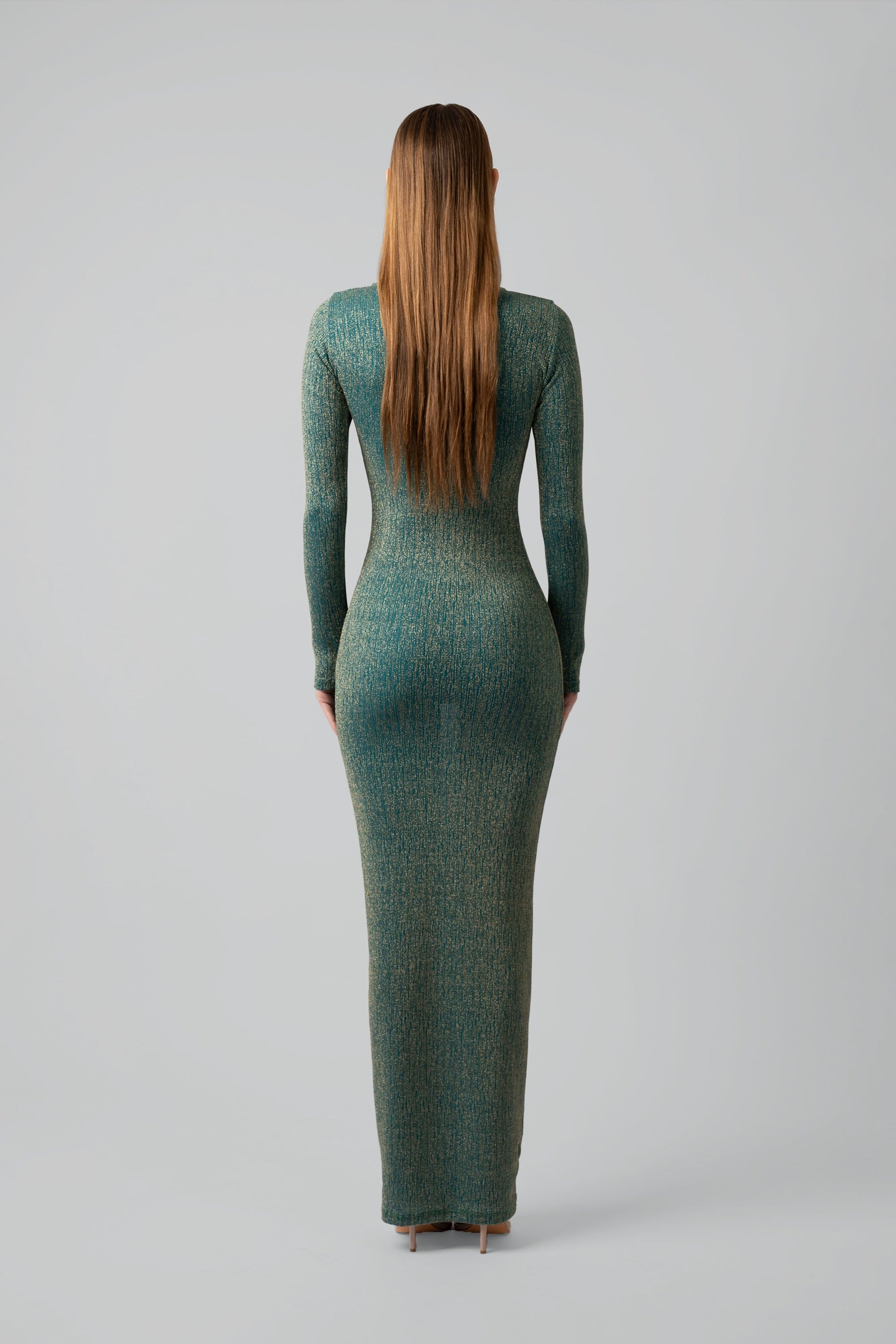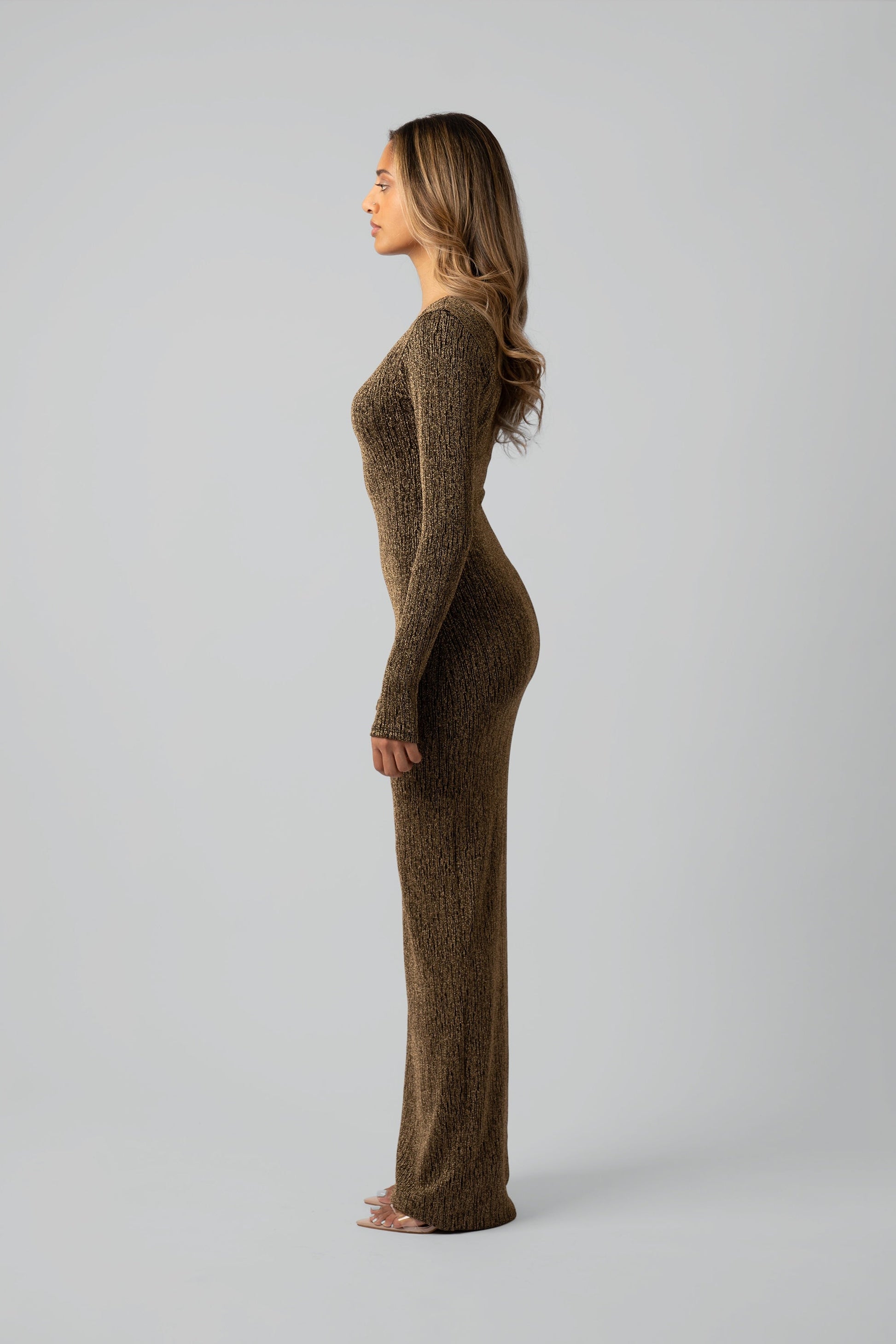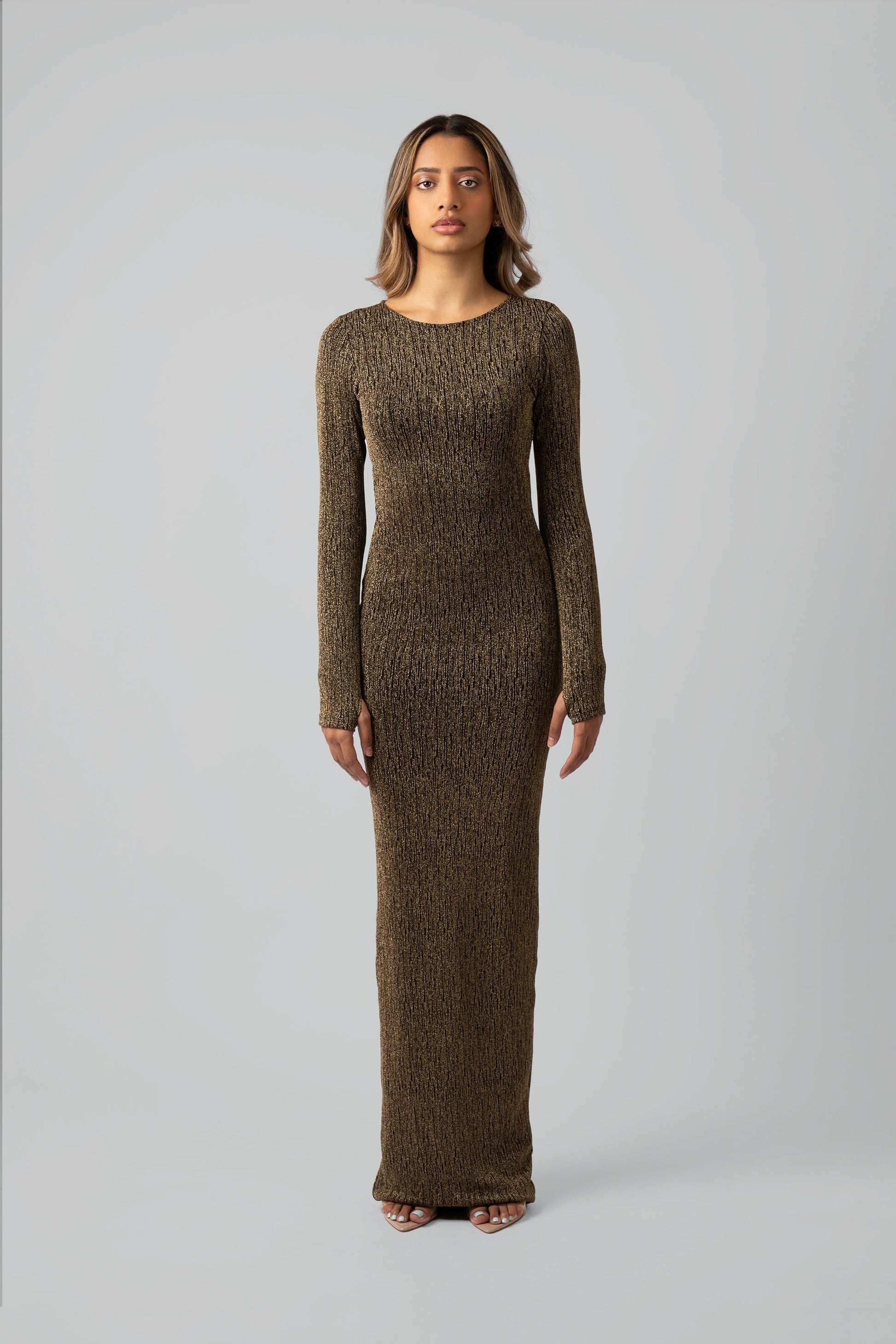 The Monarch Dress blends effortless elegance with modern comfort in a floor-length silhouette crafted from textured, shimmer stretch fabric. Thumb cut-out sleeves add a distinctive touch while keeping wrists warm, creating a look that’s both striking and functional. Perfect for evening events, red carpet moments, or elevated styling occasions.