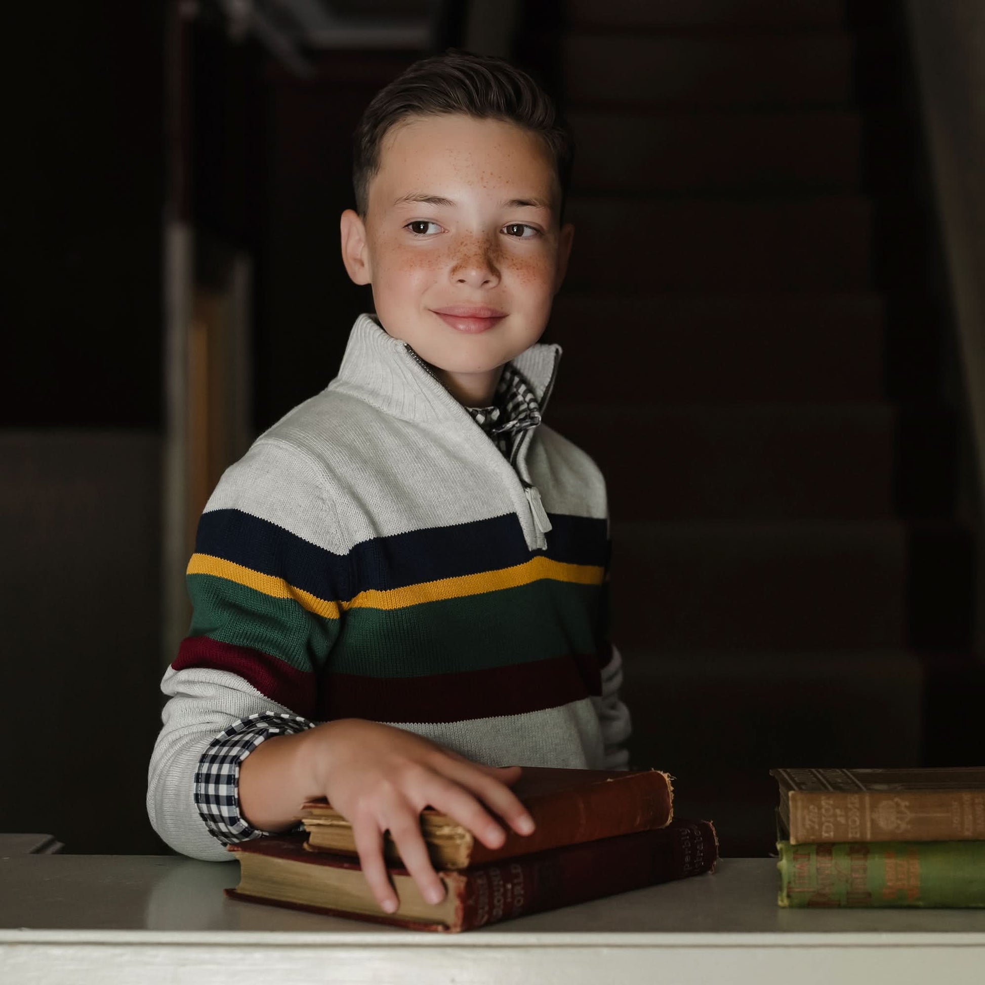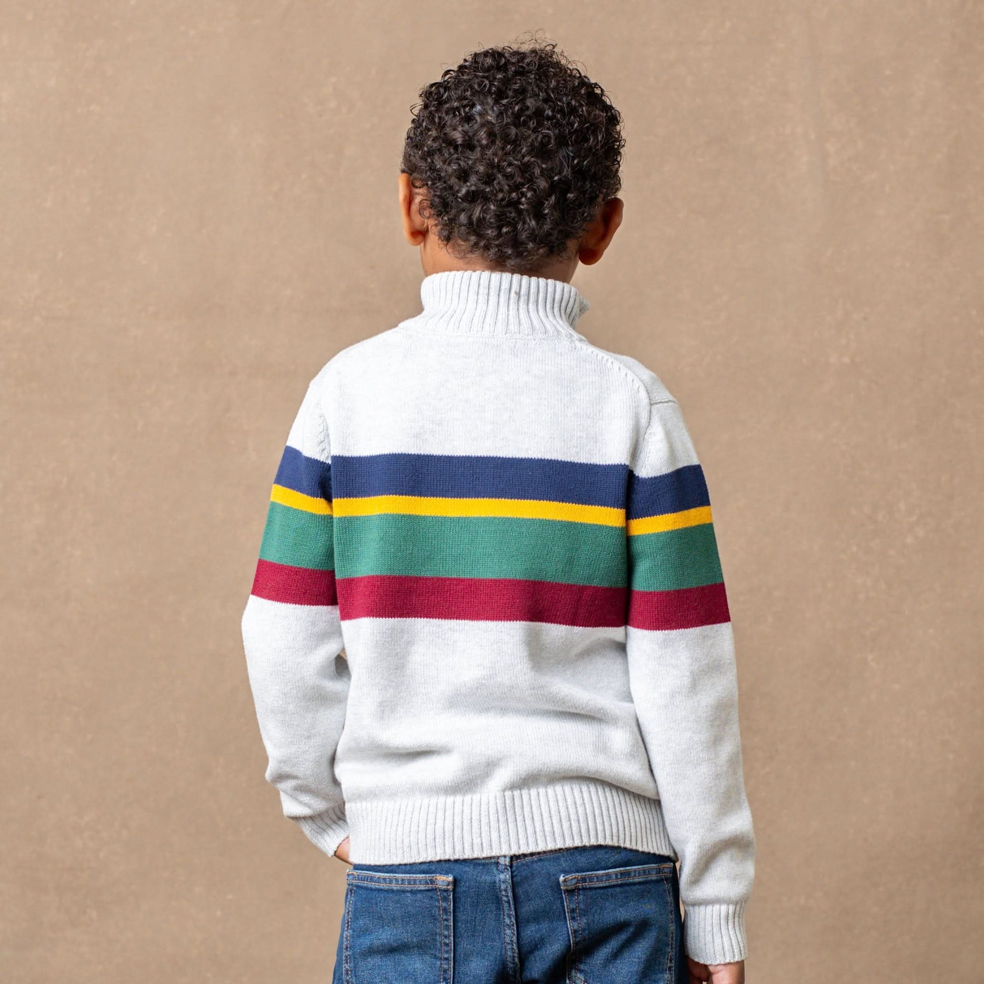 Our soft sweater will be a layering wardrobe staple for your stylish guy. Features a sporty, fall-forward engineered stripe. A ribbed mock neck and front half zip make for easy-on and easy-off, all in our signature super cozy 100% organic cotton yarn. Layer over one of our button downs for a complete look!