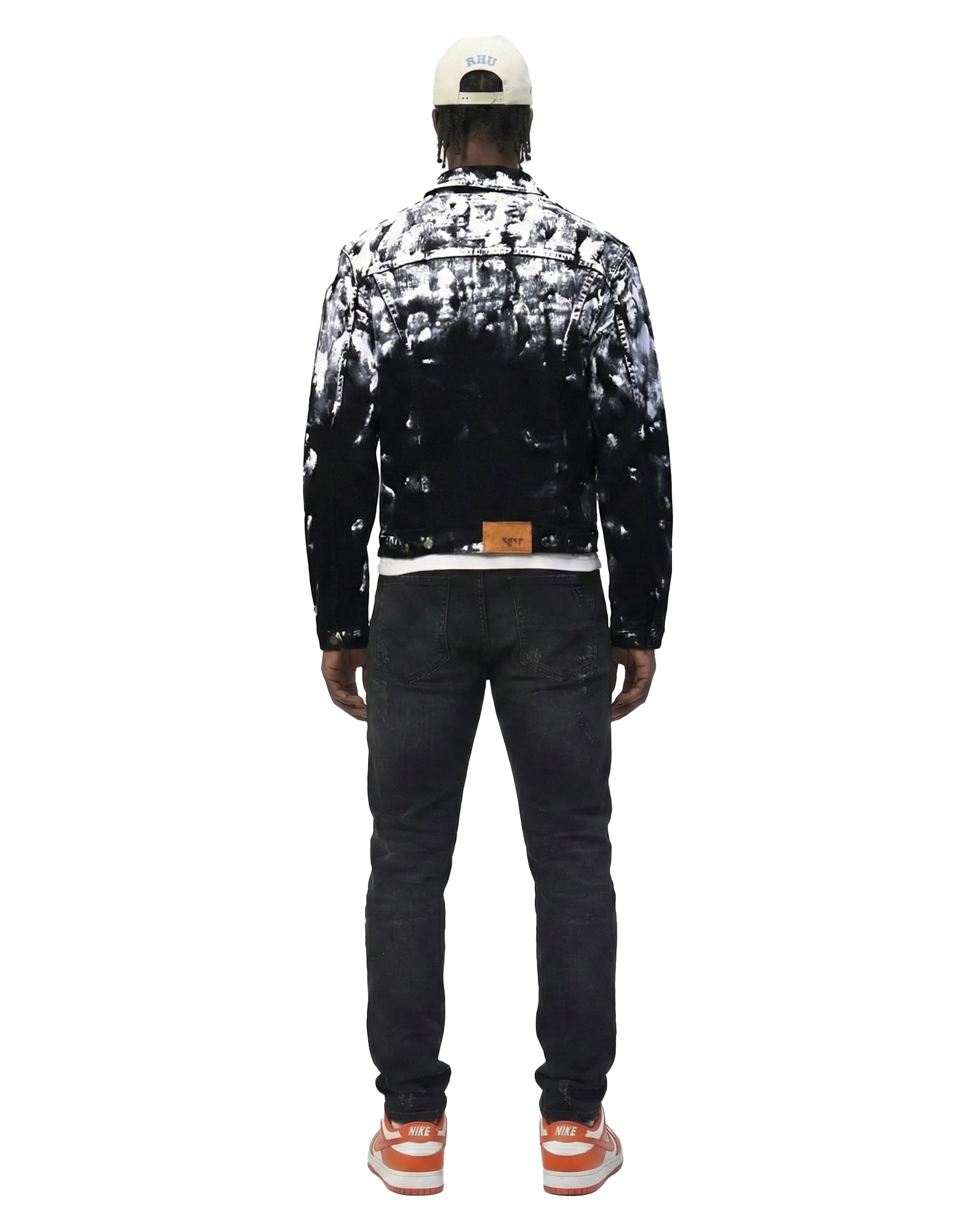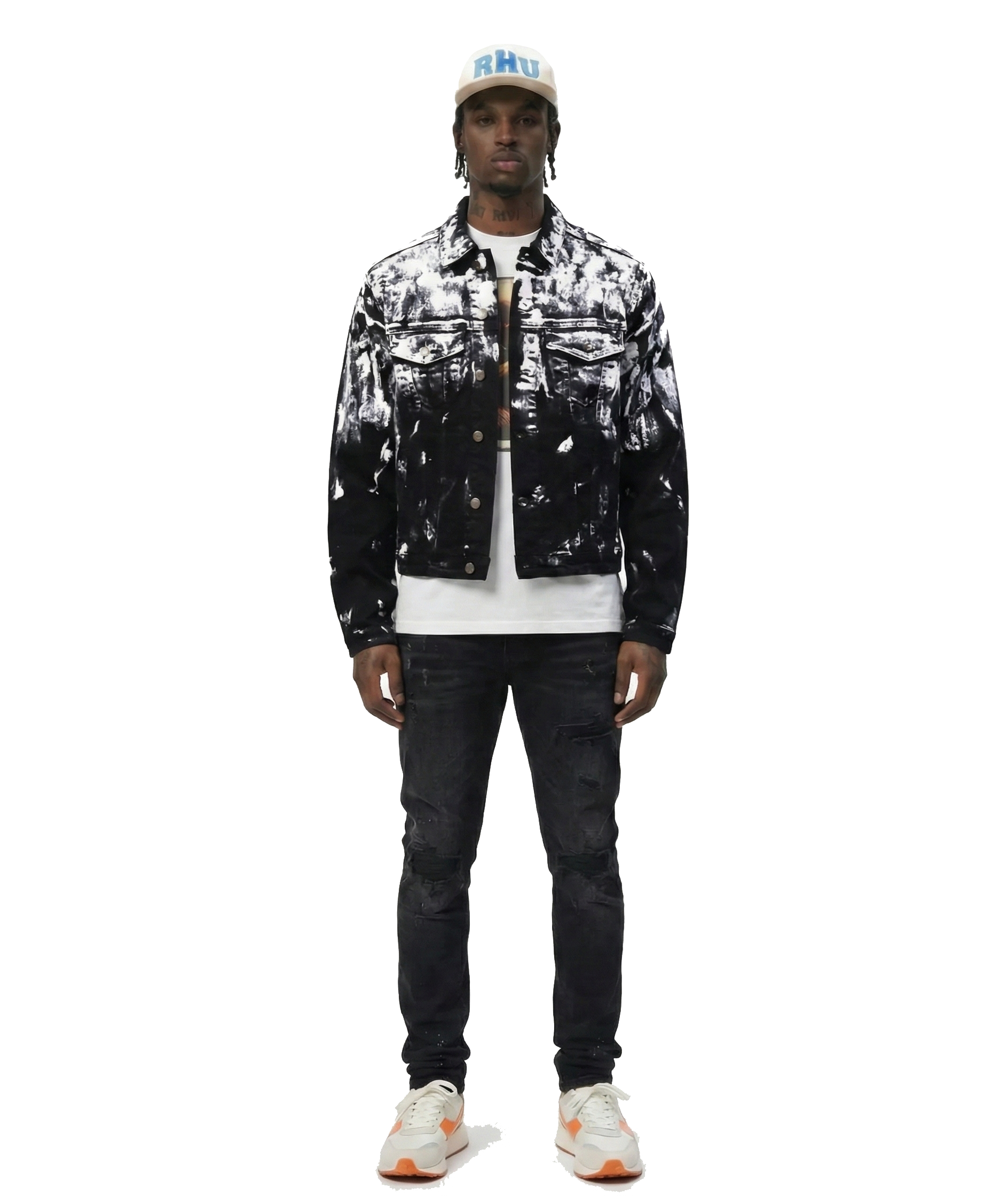 - Men's premium stretchy denim jacket with garment wash, cut blocks,and rip-off details.