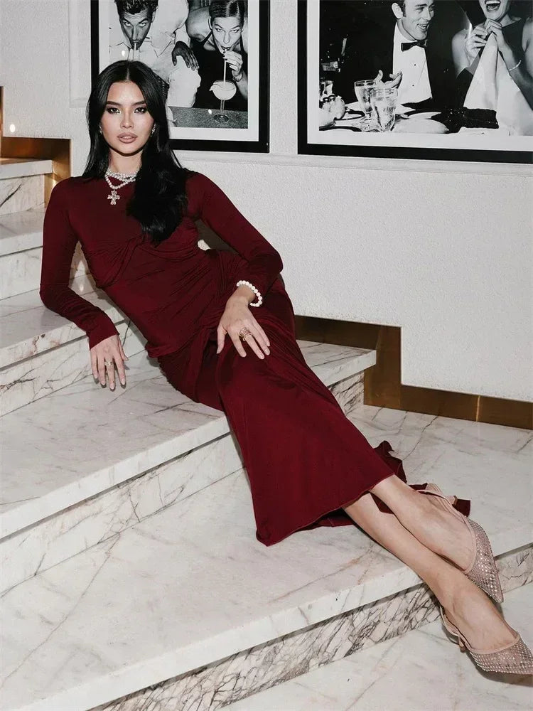 Tossy Female Pleated Sexy Maxi Dress Patchwork Twist Slim Long Sleeve Solid Y2k Autumn Streetwear Dress Women's Bodycon Dress