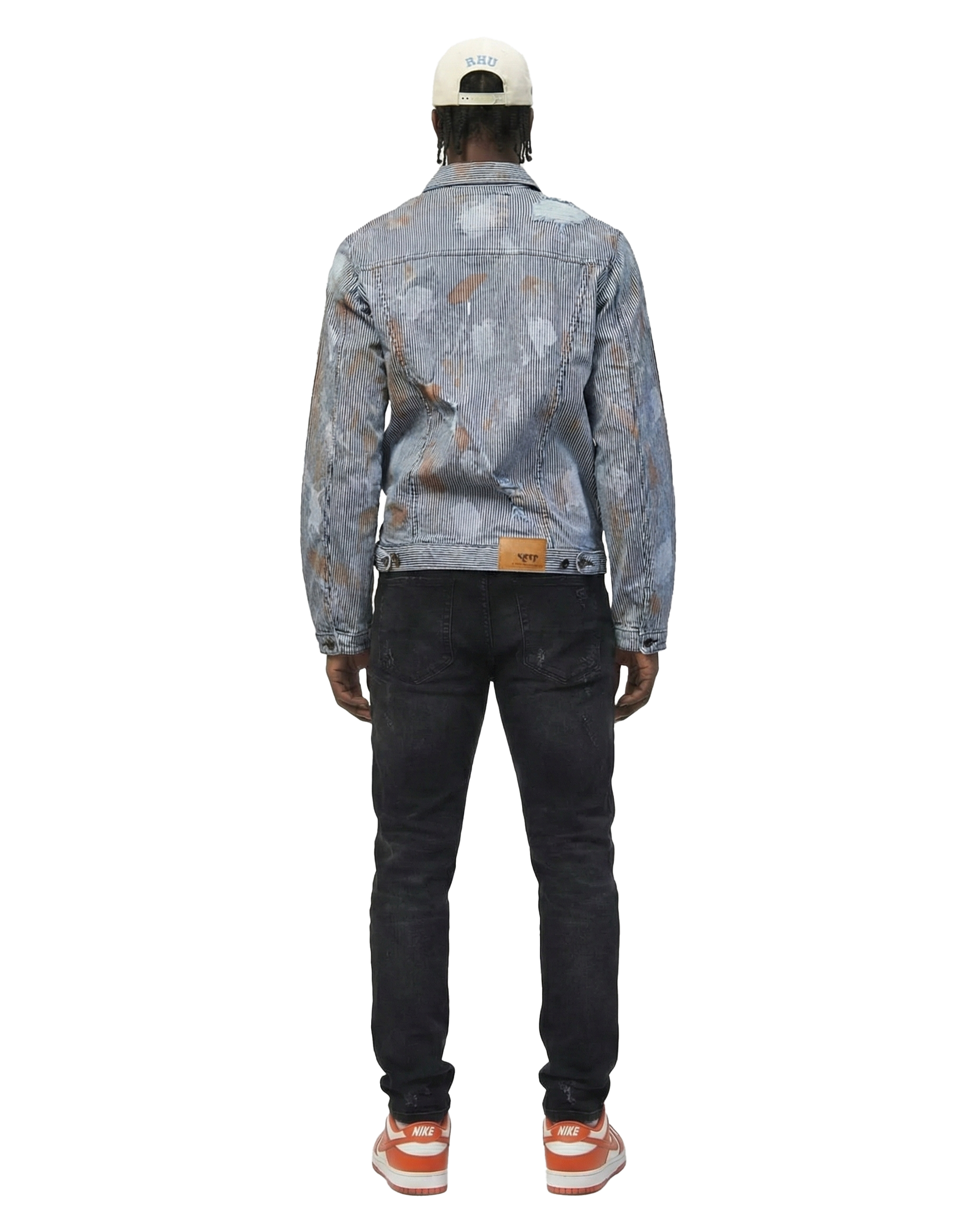 - Men's premium denim jacket with all-over pin-stripe print effects, rustic paint effects & rip-off details.