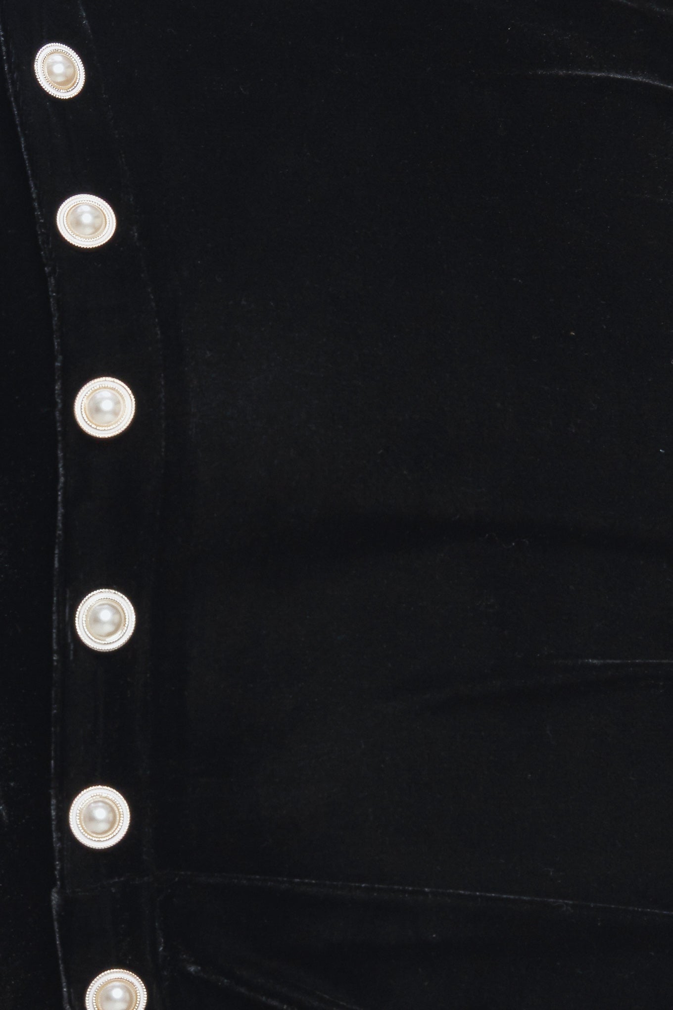 A solid velvet midi dress featuring round neckline long sleeve, side pearl button down and back zipper closure