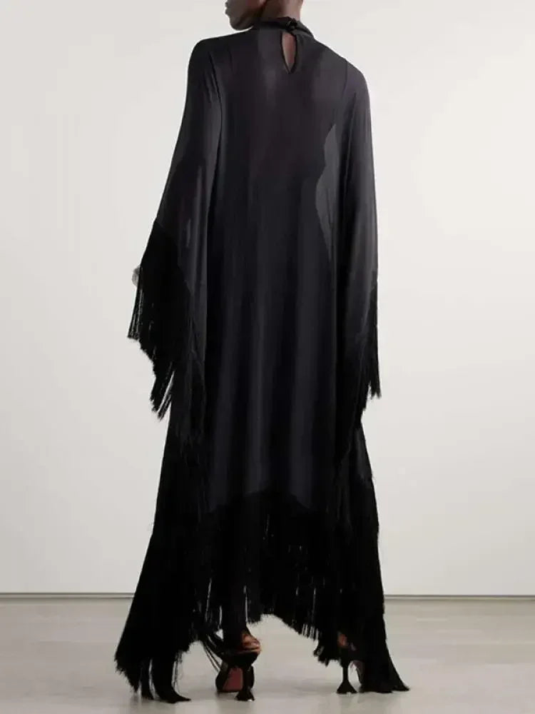 Yeezzi 2025 New Spring Fashion See-Through Tassel Party Dresses Women Batwing Sleeves Solid Color High-Neck Two Piece Set Dress